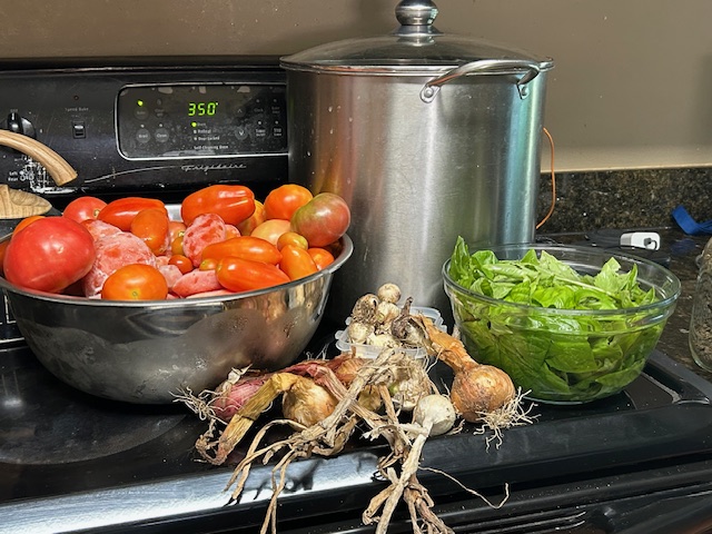 We got a pot. We got some garlic, onion, and herbs from the garden (because, of course, we did). We made tomato soup so good it would make a grilled cheese slide into your DMs.